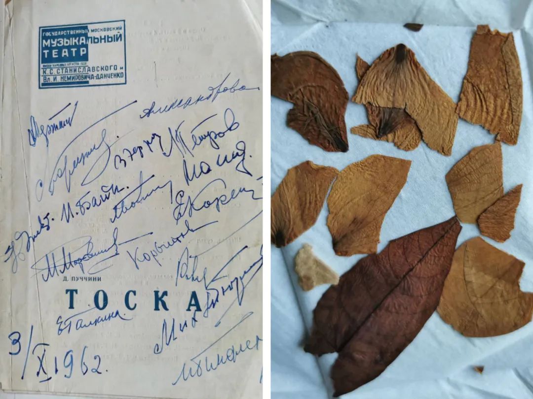 ▲郑小瑛保存的《托斯卡》所有演员签名和乐队献给她的鲜花花瓣