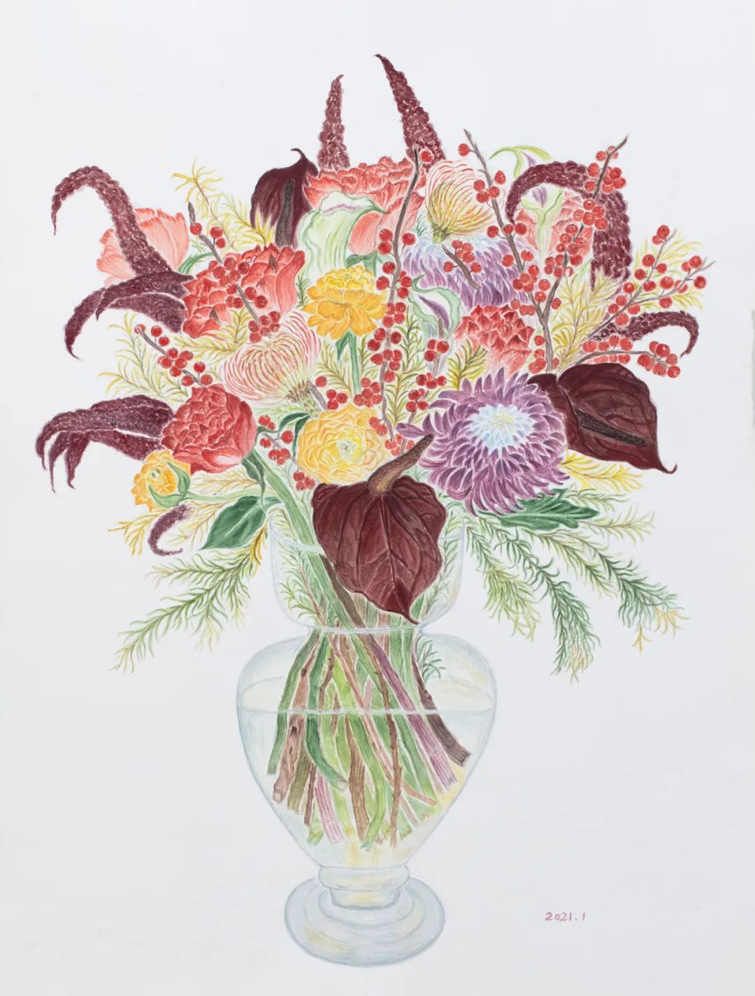 尤勇说母亲画画,就是“和花的速朽争夺时间”。按照生长的顺序来,哪个先枯,哪个先画,最后画叶子。有时候还是没赶上花期,她就老老实实画一朵耷拉着脑袋的花在边上。