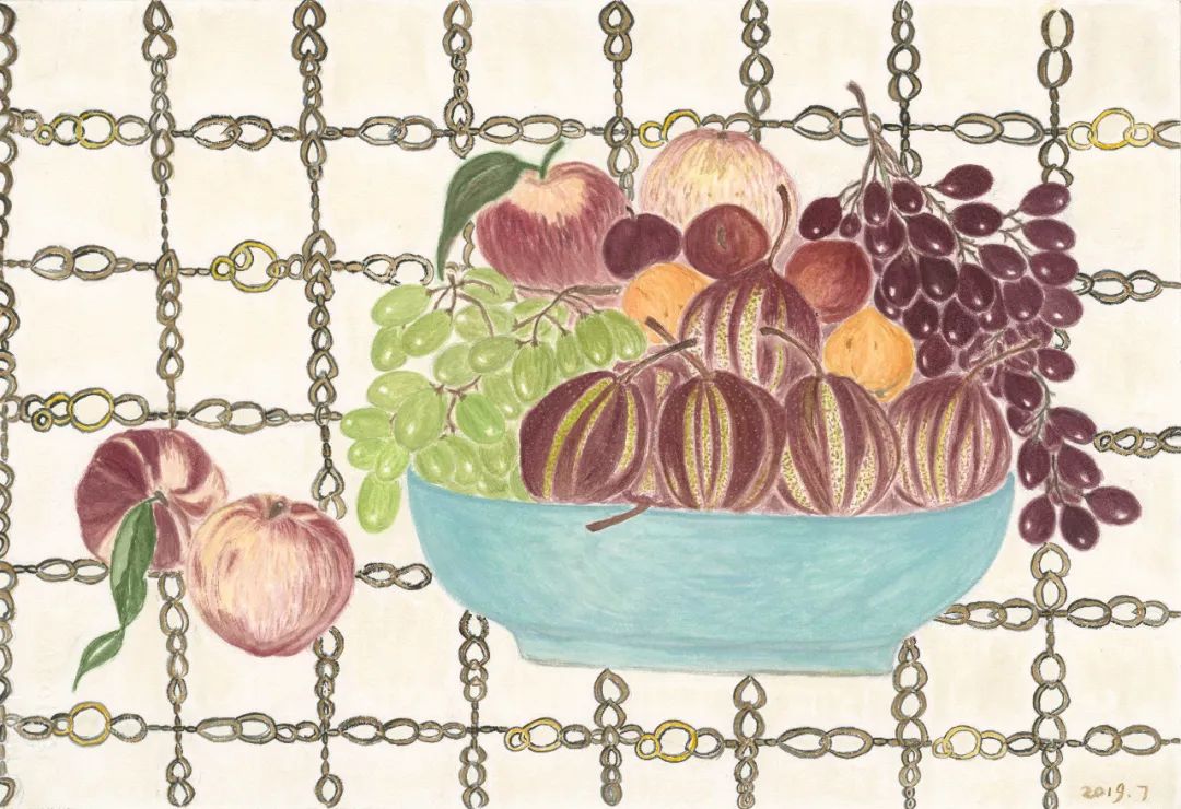 有人送来桃子,爱琴觉得光画果实有点单调,就去找卖桃子的店家,讨几片叶子。也会去卖零头布的市场,找那种人家没用的,一匹布的边角料,拿回来做垫布,放上瓜果,点缀画面的层次。
