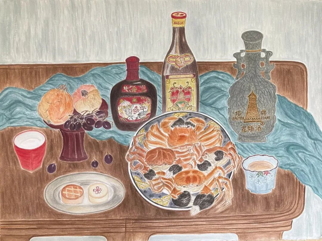 中秋节,儿子出门去了,她一个人在家,就把月饼、酒瓶、江南的螃蟹和水果凑合一下,想着等儿子回来给他看画,如此度过一个并不孤单的团圆夜晚。