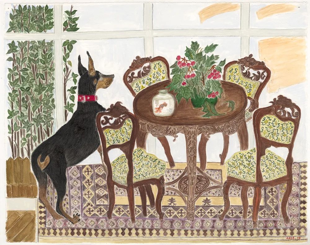 某种程度上,儿子为妈妈生生隔离出了一个温柔的环境,没有作业,没有任何可量化的标准。在这里,画画得以保留最原初、最纯粹的状态:只是因为遇上了几枝很美的花,瞥见了狗狗在窗前动人的神情,碰到了一颗长得奇怪的大白菜。