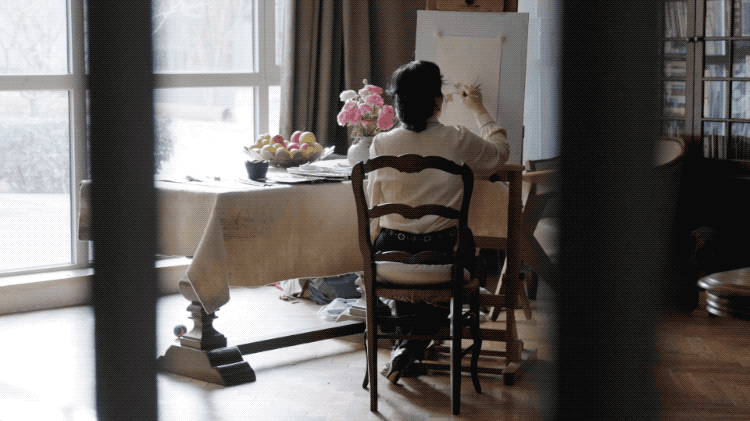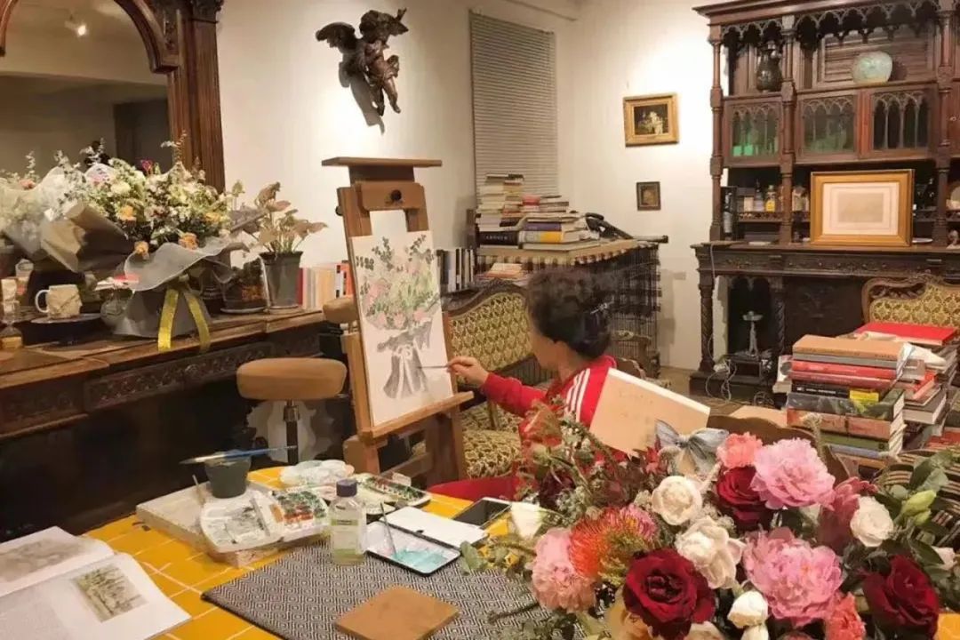 以前在工厂,工作十个小时是常有的事。现在退休了,有的是时间。她每天要在画架前坐足7、8个钟头,遇上家里装修,二楼敲得震天响,石灰落得满屋子都是,她还在自顾自画她的画。