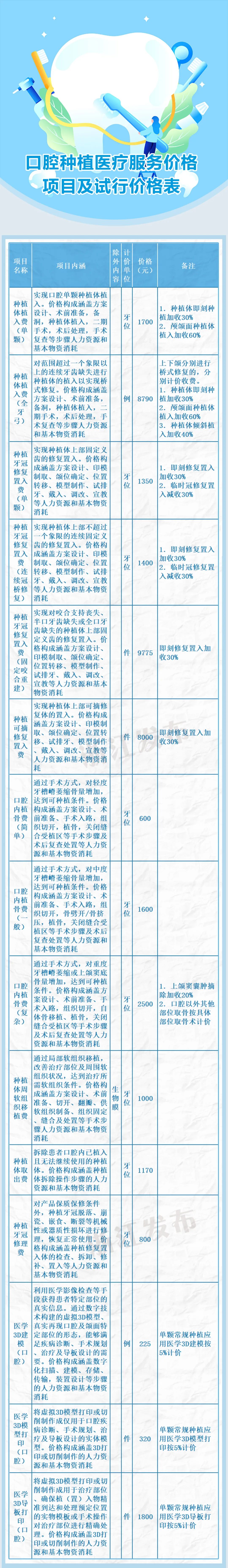 《通知》自4月1日起执行,明确设立种植体植入费(单颗)等15项口腔种植医疗服务价格项目,公立医疗机构实行政府指导价管理。原口腔种植项目按市场调节价管理,价格由医疗机构自主确定。