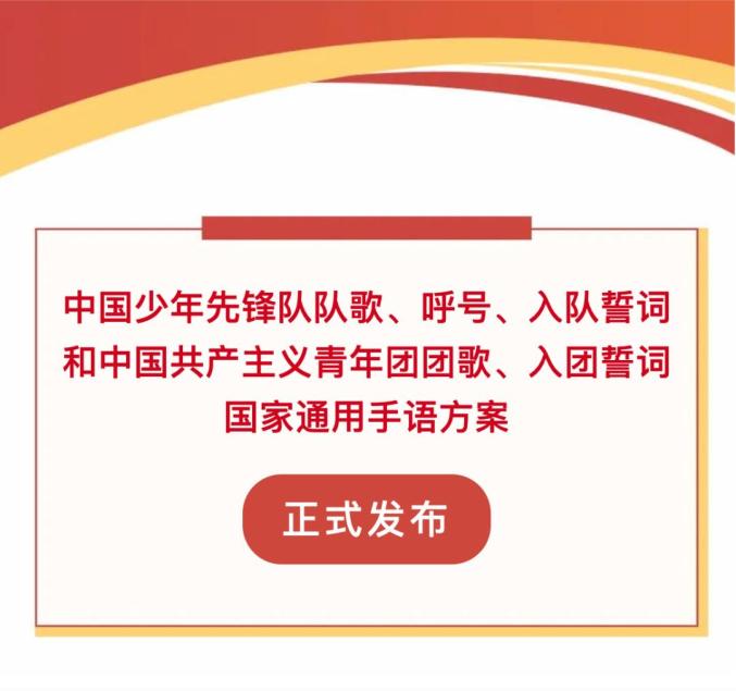 中国残联、教育部、国家语委联合发布语言文字规范《中国少年先锋队队歌、呼号、入队誓词和中国共产主义青年团团歌、入团誓词国家通用手语方案》。该规范经国家语委语言文字规范标准审定委员会审定。该规范以听力残疾青少年使用者为主体,规定了中国少年先锋队队歌、呼号、入队誓词和中国共产主义青年团团歌、入团誓词的国家通用手语表达方式,全面准确阐释队歌和团歌的深刻内涵,满足听力残疾青少年规范、统一、严肃使用手语表达队歌和团歌的愿望。该规范不仅有效保障了听力残疾青少年语言文字及平等参与社会生活的权利,也进一步引导和培养听力残疾青少年坚定理想信念,坚定不移听党话、感党恩、跟党走,成长为德智体美劳全面发展的社会主义建设者和接班人。