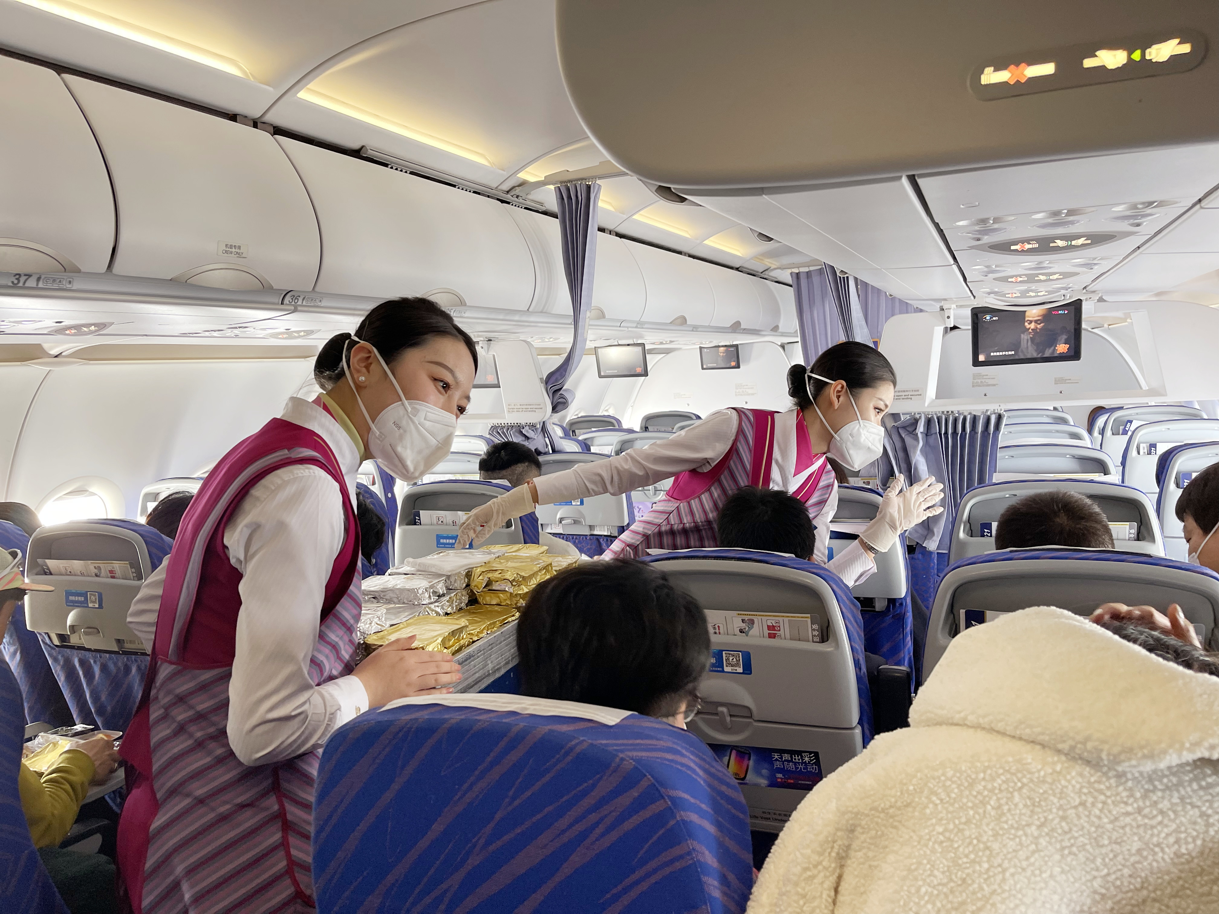 南航乘务员向旅客提供餐食。受访者供图