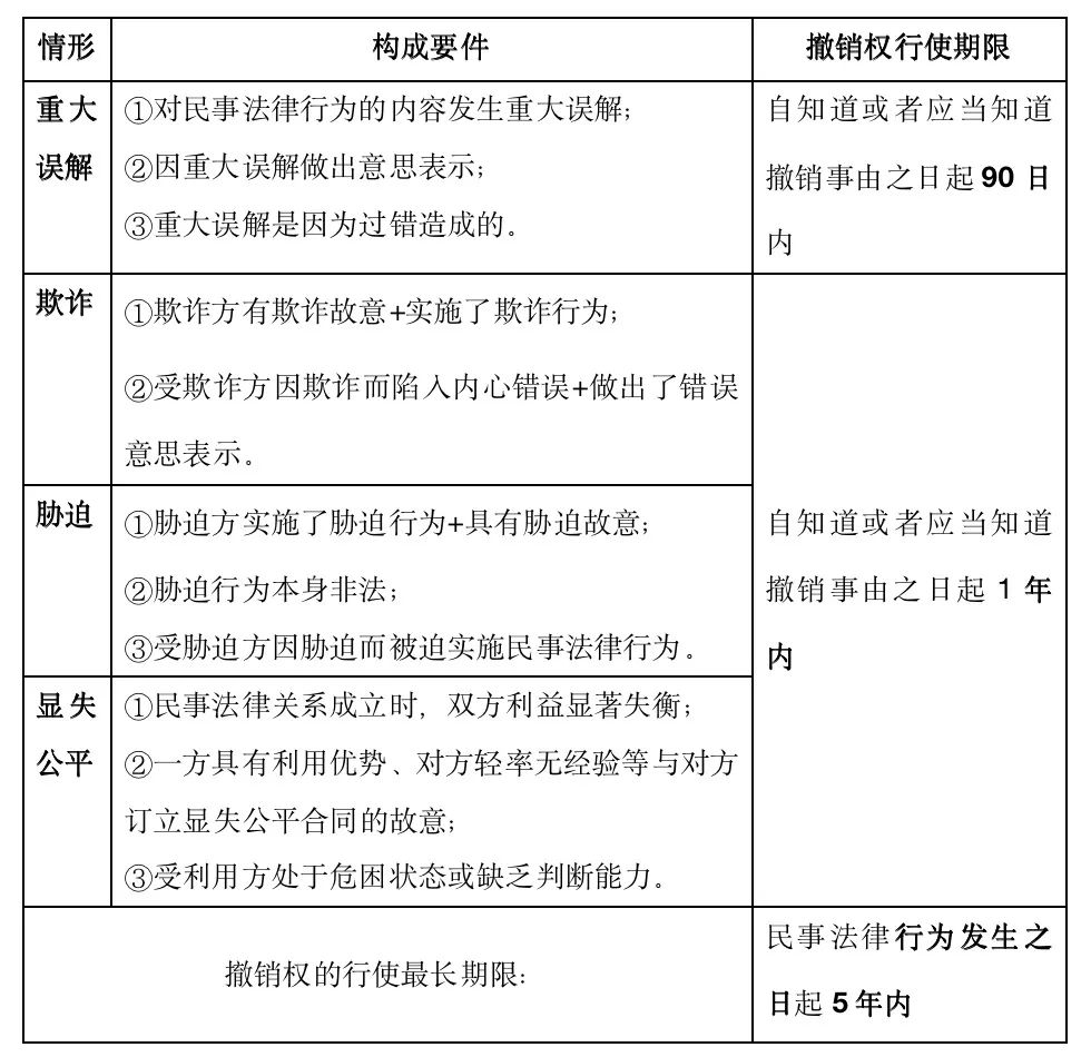 四种撤销情形的构成要件和行使期限如下表所示: