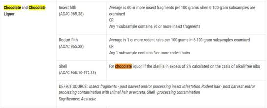 以美国的食品药品监督管理局的检测标准来看,平均每 100 克巧克力中的虫子碎片数量低于 60 个就算合格。
