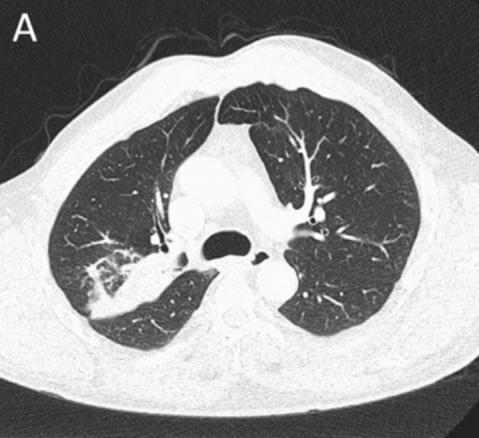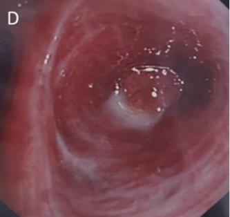 CT检查示右后上叶实变,没有看到含气支气管影,怀疑是支气管内肿瘤导致阻塞后实变(图1 A)。支气管内膜异常也出现在中间支气管和左主支气管(图1B、1C)。支气管镜检查显示,左侧主支气管、右侧中间支气管和右上叶后段支气管有大量息肉样肿块。(图2)