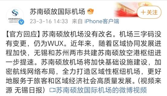 随后,苏南硕放机场对此辟谣称,“没有改名,机场三字码没有变更,仍为 WUX”。