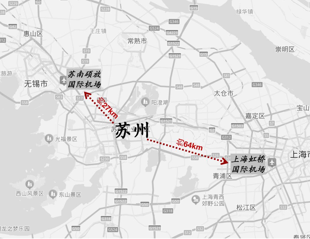 苏州市中心距上海虹桥机场不到几十公里,相当于广州南沙区到广州白云机场的距离;而与上海接壤的昆山距虹桥机场更近,最近处的花桥镇到虹桥仅有30公里。