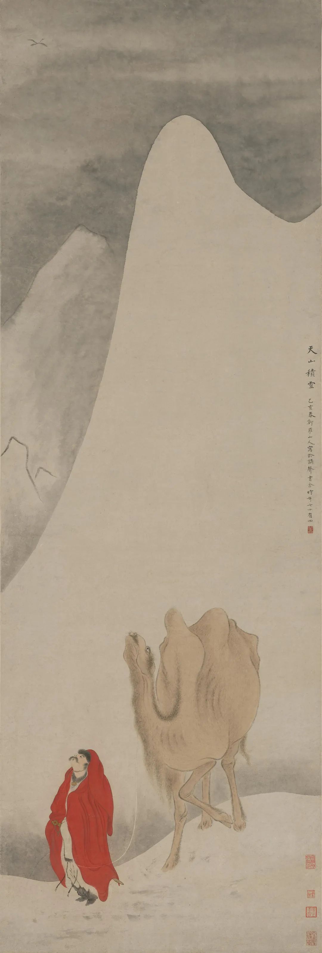 (清代绘画大家华嵒(yán)《天山积雪图》轴,天山脚下,身披红色斗篷的单身旅客与一老驼缓行于冰雪之中,图片来源@wikimedia commons)