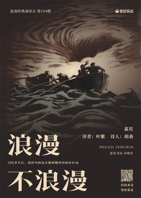 塞缪尔·泰勒·柯勒律治是英国浪漫主义文学巨匠和奠基人之一,“湖畔派”诗人代表。《古舟子咏(插图珍藏版)》,将单首诗歌以中英对照的方式,出版了超大开本,来呈现柯勒律治笔下的那个壮阔世界。3月24日晚,《古舟子咏(插图珍藏版)》译者叶紫、诗人胡桑,将带读者们领略柯勒律治式的浪漫,进一步了解其诗歌背后的故事。