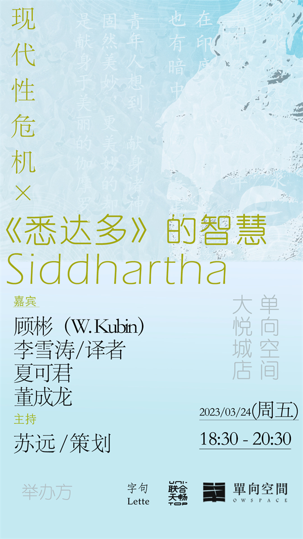 黑塞的《悉达多》,几乎与同时代的英语世界诗歌《荒原》、德语犹太化小说《城堡》、法国小说《追忆似水年华》一道,在伟大之年,确立了一个现代生命的伟大范例。3月24日,在单向空间·大悦城店,李雪涛教授将与德国著名汉学家顾彬( Wolfgang Kubin)、夏可君教授与董成龙副教授一起,与你一起探讨《悉达多:一首印度的诗》中所包涵的现代性危机、德意志文化在文学中的显著特点、自我救赎的文学叙事传统,黑塞与瑞士(在欧洲的特别地位)、黑塞的时代(两次世界大战期间),以及从黑塞与托马斯·曼等人的交从过往中一瞥这部小说写作的历史文化背景。