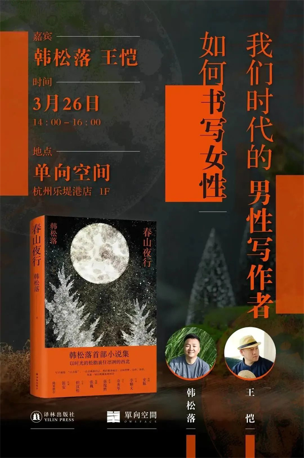 在韩松落首部小说集《春山夜行》中,故事的主角,基本都是女性。男性作家为何选择又如何叙述女性?我们将保留一个问号,以此作为起点去探讨性别与作品的关系,进行一场坦诚的对话。本周日下午,在单向空间·杭州乐堤港店,我们邀请了韩松落与作家王恺,聊聊我们这个时代的男性写作者和他们笔下的女性角色。