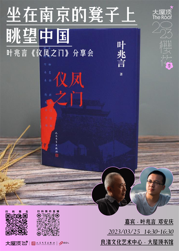 在作家叶兆言40年的写作中,一个永恒的主题,都绕不开他生活了六十多年的地方——“秦淮”、“南京”。2022年,叶兆言带来了他的最新长篇小说《仪凤之门》,这一次,南京依然是他书写的主题。3月25日下午,叶兆言将来到大屋顶,和各位读者分享这部最新长篇力作的写作故事,和杭州的朋友们聊一聊他是如何坐在南京的凳子上眺望中国。