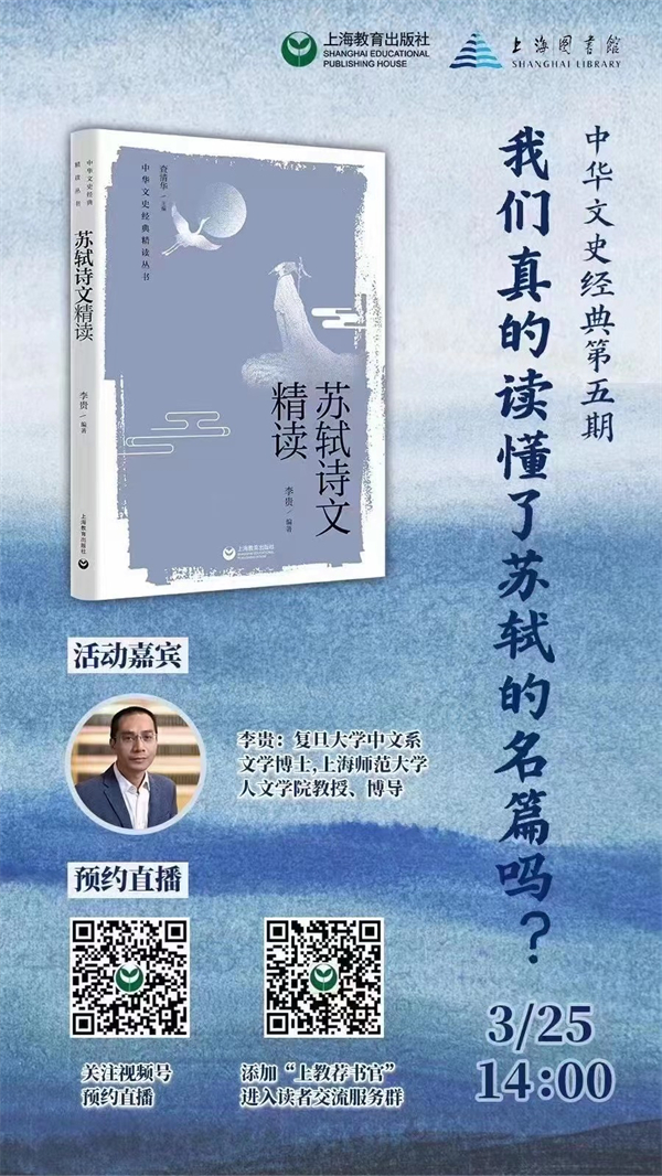北宋大文豪苏轼的许多作品都脍炙人口,但我们真的读懂了吗?《赤壁赋》“吾与子之所共食”的“食”为何不是“适”,《后赤壁赋》梦见的是“二道士”还是“一道士”,《赤壁怀古》中“灰飞烟灭”的到底是“樯橹”还是“强虏”?李贵教授将讲述准确解读苏轼作品的方法,与大家一起厘清误读,深化浅读,为准确地读懂苏轼、阐释苏轼提供坚实基础。