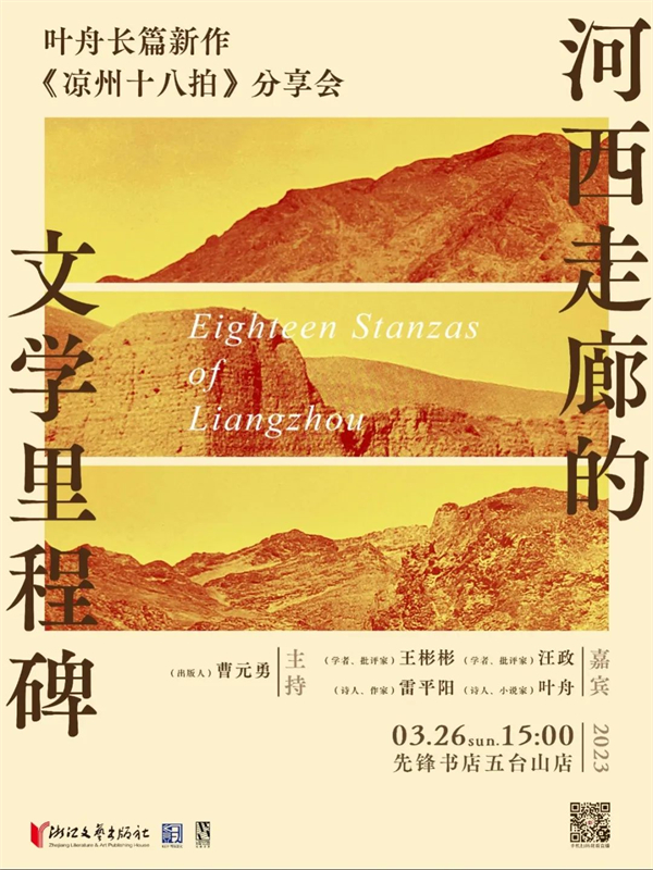 在叶舟根植于西部的写作中,我们能够发现更多具有超越性的、普遍性的意义。中国作家协会书记处书记、著名批评家施战军这样评价道:“叶舟在今天写出《凉州十八拍》,其意义是里程碑式的。”这样一部长篇巨作,无疑是一座树立在河西走廊大地上的文学里程碑。3月26日下午,《凉州十八拍》作者叶舟,学者、批评家王彬彬,学者、批评家汪政,诗人、作家雷平阳,以及出版人曹元勇将做客南京先锋书店,围绕西北边地书写中的家国叙事、河西大地上绵延不绝的民族精神等主题,就《凉州十八拍》一书展开精彩交流与分享。