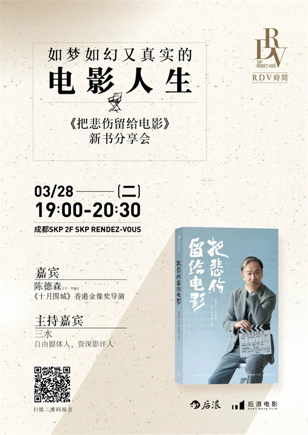 回望港片黄金时代,从小助理到大导演,陈德森将人生历程全都酿造进了自己的书里。这本《把悲伤留给电影》讲述了陈德森不畏挑战的逐梦之旅——前半生人生如戏,后半生戏如人生!3月28日,我们邀请到香港金像奖导演陈德森做客成都SKP,向各位分享他如梦如幻又真实的精彩人生。