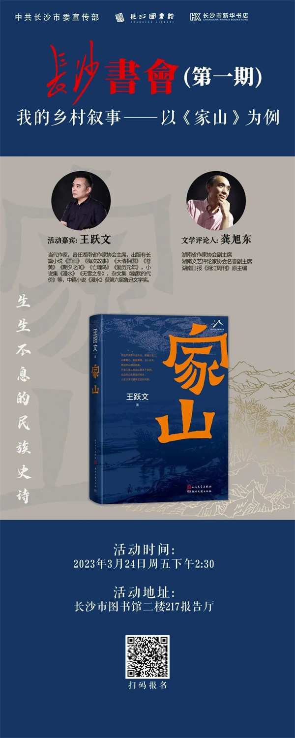 王跃文的新作《家山》与读者见面,这部小说里的故事发生地——南方乡村“沙湾”,其原型正是“漫水”,王跃文的家乡。《家山》书写了一个跨越五代人的故事,呈现的是作者熟悉的乡村民俗史,也是一个时代的变迁史。王跃文说,他想通过一个乡村去展示一个时代的风云际会,一个民族的生生不息。周五下午,作家王跃文将与文学评论人龚旭东一起对谈这部新作。