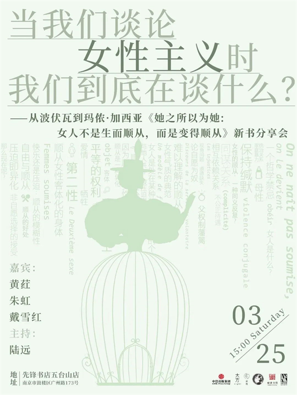 即使是那些最有独立意识、最具女性主义倾向的女性,也会在不经意间发现,她们享受男性对她们投来的具有征服意味的目光,她们渴望成为伴侣怀中一只温顺的宠物,相比那些看上去更能让她们绽放自我的工作,她们更愿意去干干家务活儿,从叠得整整齐齐的衣服、为家人精心准备的早餐中获得小小的乐趣。这些欲望和乐趣同女性的独立是否矛盾?这些下意识的顺从是天性使然吗?3月25日下午,我们邀请到《她之所以为她——女人不是生而顺从,而是变得顺从》一书的译者、南京大学法语系教授黄荭老师,以及南京大学市场营销系朱虹教授、南京大学马克思主义学院戴雪红教授作为嘉宾,南京大学社会学院陆远老师担任主持,与三位“hong”教授一起畅谈从波伏瓦到玛侬·加西亚时代的“女性主义”。