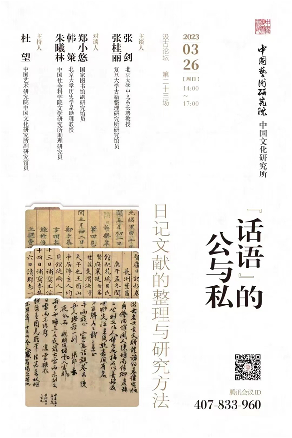 日记作为记录个人经历与情感的文本,其形式流传已久。在文史研究涉及的各类材料中,私密性高、吐露较为自然率直的日记和书信,是备受关注的两种史料,其中尤以日记的内容和信息更为丰富。日记号称“百科全书”,可以展现作者当时的情绪、心态,反映他们所生活时代的信息、环境、背景;其私人化的书写形态,也提示我们对这类文体的话语特质应予认知和理解。中国近代日记存世数量巨大,超过此前日记文献数量的总和。近年来,由北京大学教授张剑主持出版的《中国近现代稀见史料丛刊》系列,不断推出最新整理研究成果,在学界引起极大反响,丛刊目前已出至第九辑,其中80%以上均为日记和书信。“汲古论坛”第二十三场学术活动,即以晚近以来的日记文献为关注焦点,邀请张剑教授、张桂丽研究馆员等专家分享经验,以系统总结日记文献的整理与研究方法、深度解析和阐释日记文体的话语特性。