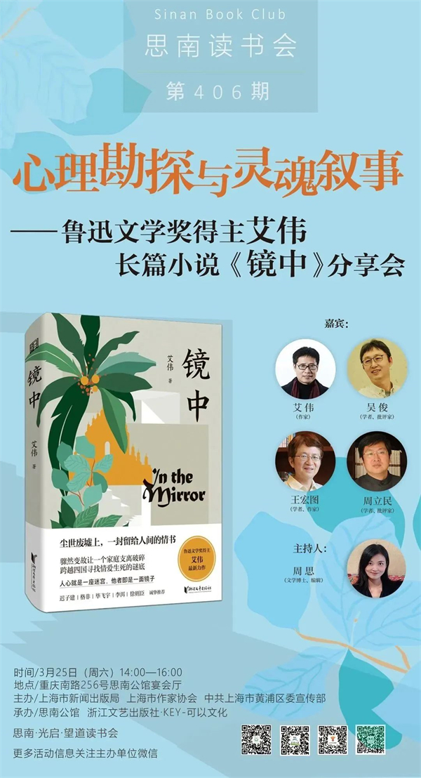 《镜中》是第八届鲁迅文学奖得主、浙江省作家协会主席艾伟的最新长篇,书写了生命的坚韧和爱的恒久力量,是一部触动万千读者的治愈之书,也是一部超越中国当代叙事传统,与世界文学对话的突围之作。3月25日下午,学者、作家王宏图,学者、批评家周立民,学者、批评家吴俊,作家艾伟,以及文学博士、编辑周思将做客思南读书会,围绕文学作品的精神力量、小说写作与建筑艺术、亲密关系中的平衡与失衡等主题,就《镜中》一书展开精彩交流与分享。
