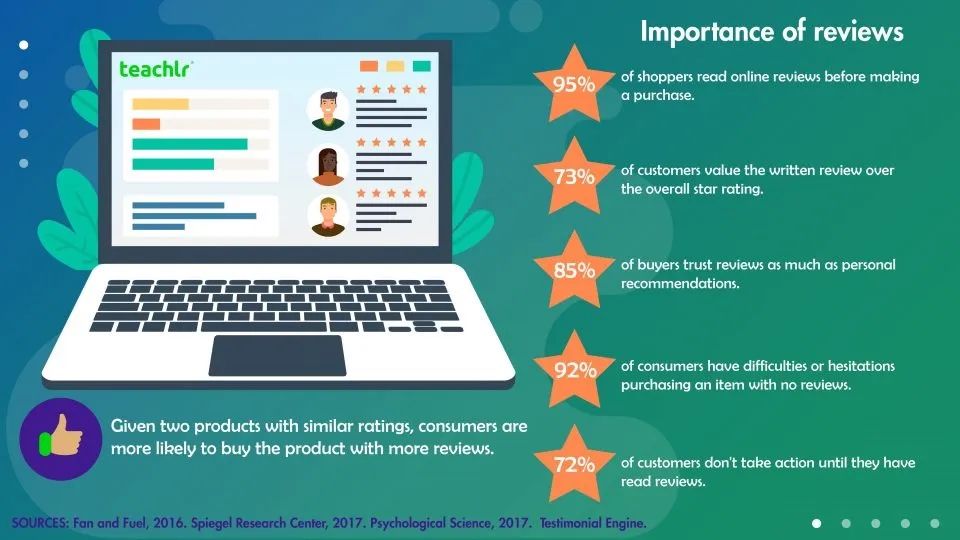 研究表明,人们首先会看分数和星级,然后如果我们必须从两个星级相同的东西之中选一个,评价数量更多的那个更好。
