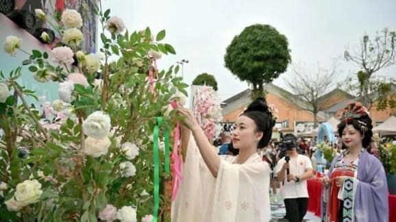 汉服爱好者将彩带挂在花枝上,蕴意美好。在大街小巷、公园景区、或是书店博物馆,越来越多的人开始关注和选择汉服,不是刻意的追求复古,而是一种对传统文化艺术的敬仰和传承。