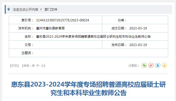 说明:公告详情请登录惠东县人民政府门户网站查看《惠东县2023-2024学年度专场招聘普通高校应届硕士研究生和本科毕业生教师公告》