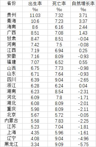 其中,在人口出生率方面,23个省份中,只有两个省份超过了1%即千分之十,为贵州和青海,都来自西部地区。其中,贵州为11.03‰,青海为10.6‰。有三个省份的出生率介于8‰-9‰之间,分别是海南、广西和甘肃。出生率在7‰以上8‰以下的有4个省份,分别是河南、江西、安徽和福建。