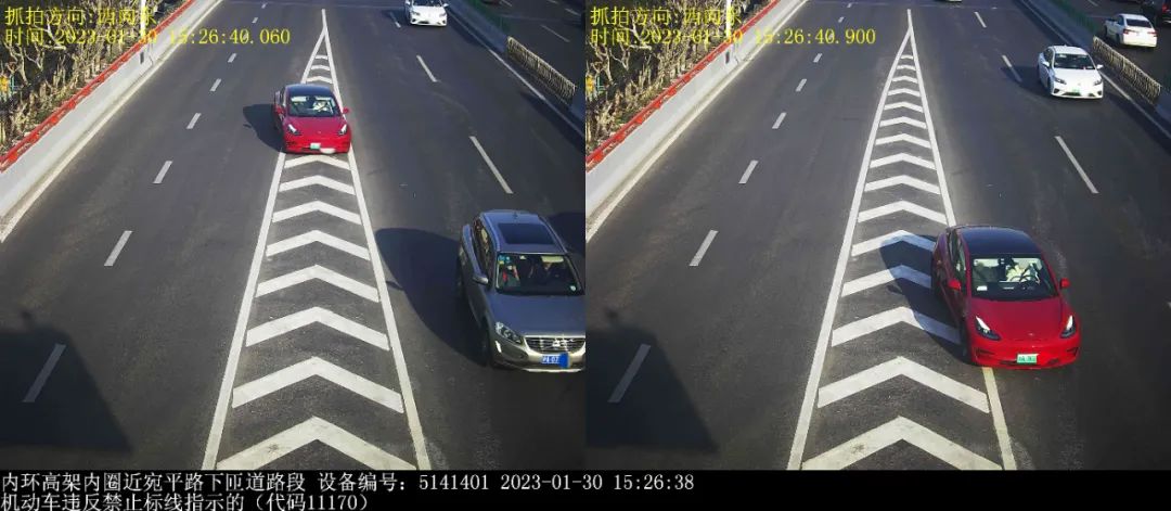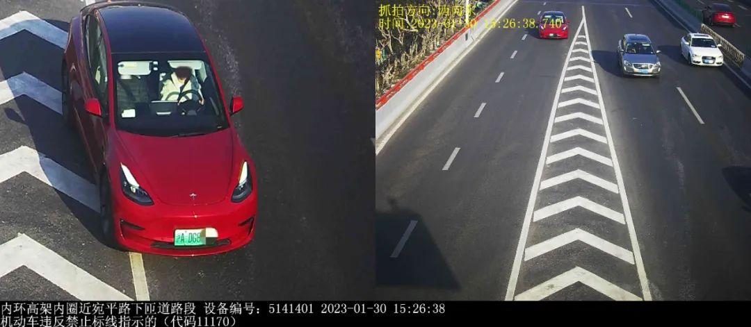 ▲2023年1月30日15时26分,号牌为沪ADG***的小型轿车在内环高架内圈近宛平路下匝道路段,实施了“机动车违反禁止标线指示的”违法行为。处罚:罚款200元,记1分