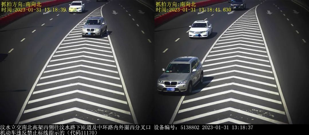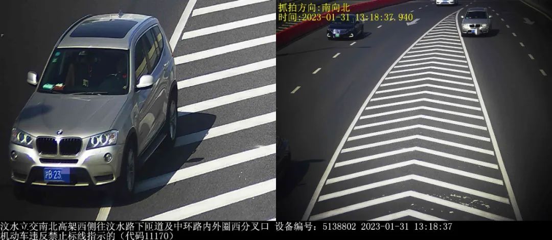 ▲2023年1月31日13时18分,号牌为沪B23***的小型轿车在汶水立交南北高架西侧往汶水路下匝道及中环路内外圈西分叉口,实施了“机动车违反禁止标线指示的”违法行为。处罚:罚款200元,记1分