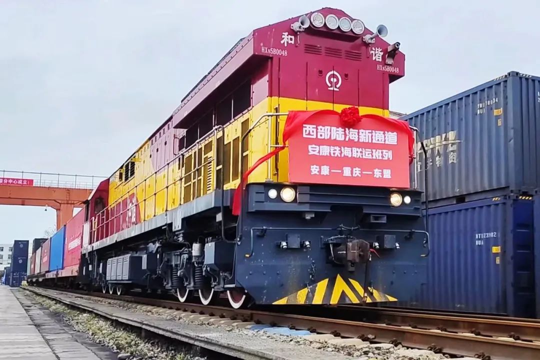 首趟西部陆海新通道(安康—东盟)铁海联运班列开行24日下午,随着一声机车汽笛长鸣,装载着板材货物的88392次列车从安康东站货场缓缓驶出,一路向南经重庆集结转运至钦州港出境,开往印度尼西亚雅加达,标志着首趟西部陆海新通道(安康—东盟)铁海联运班列正式开行。(首席记者 梁璠)