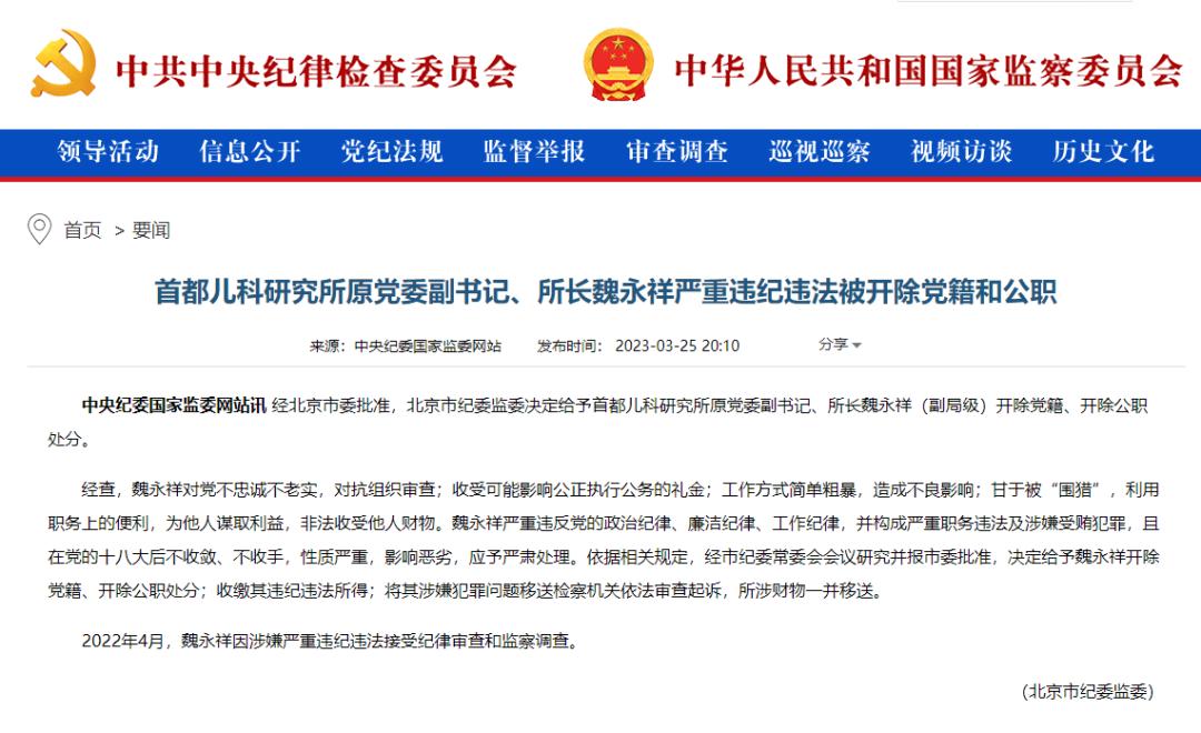 25日,据中央纪委国家监委网站消息,经北京市委批准,北京市纪委监委决定给予首都儿科研究所原党委副书记、所长魏永祥(副局级)开除党籍、开除公职处分。