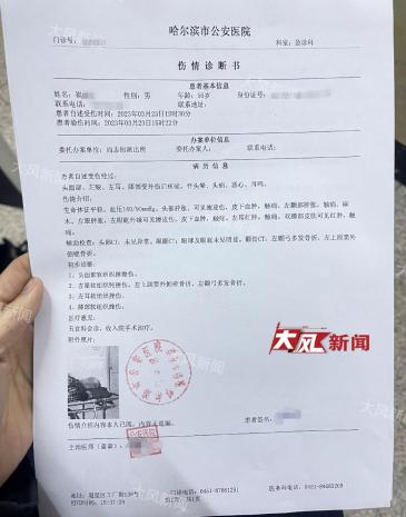 哈尔滨市公安医院伤情诊断书显示,委托办案单位是尚志街派出所。初步诊断,崔师傅头面部软组织挫擦伤,左眼软组织钝挫伤,左上颌窦外侧壁骨折,左颧弓多发骨折,左耳和膝部软组织挫伤。