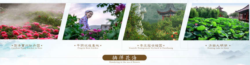 可以徜徉花海,在菏泽曹州牡丹园赏牡丹芍药的群芳争艳,在平阴玫瑰基地闻玫瑰花的馥郁芬芳,在枣庄冠世榴园看石榴花的火红热烈,在济南大明湖观映日荷花与荷叶田田。可以遍访田园,到博山红叶柿岩观漫山红遍,感受鲁中乡村的静谧安然;到威海东楮岛村静听海草房边的渔舟唱晚,享醉心清闲;到济宁等闲谷体味时尚山村的文艺“潮”范儿,释放小资情怀。
