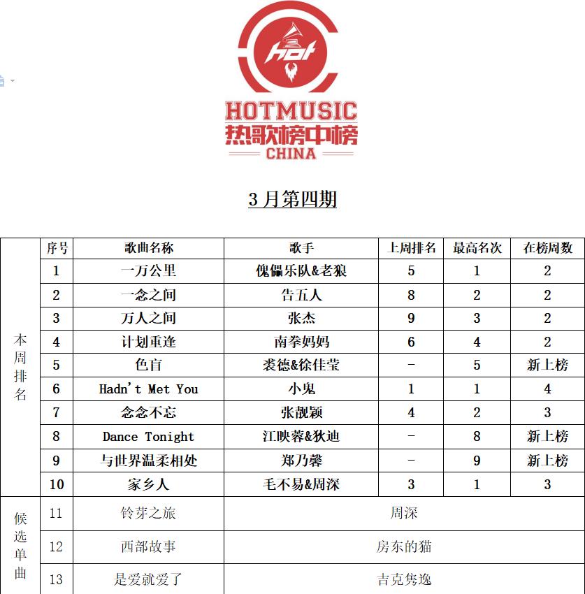 原标题:《3月最新热歌榜:傀儡乐队&老狼《一万公里》简洁有力、充满摇滚乐的原始冲击力!》