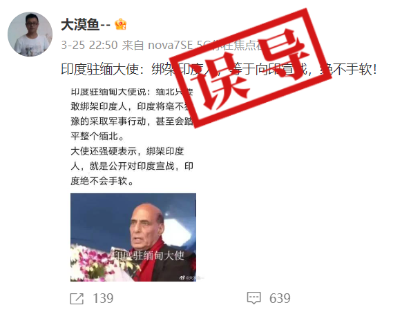 截至发稿,用缅甸语、印地语和英语对网传说法中 “印度驻缅甸大使”“拉布·库马尔”“缅甸”“军事行动”等关键词进行检索,除社交平台和自媒体有类似说法流传外,并未显示其它主流媒体的相关报道,在印度驻缅甸大使索拉布·库马尔的社交平台账号上也没有找到相关发言。