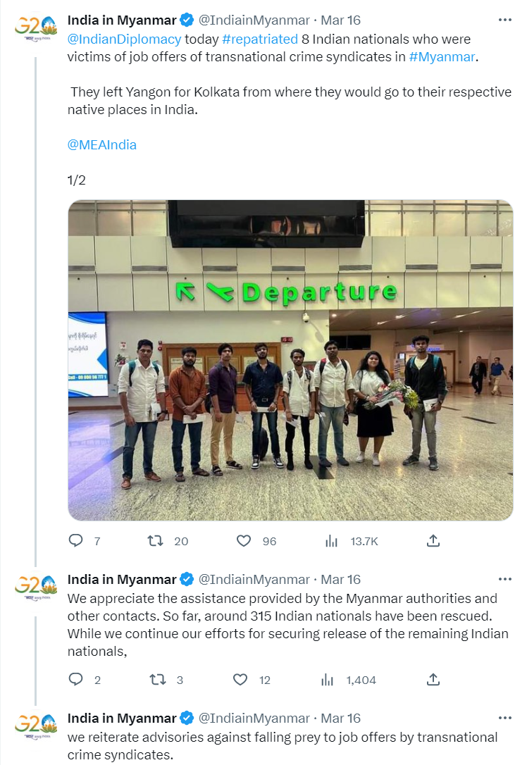 印度驻缅甸大使馆在2023年3月16日发布推文称,“今日遣返了8名印度侨民,他们是缅甸跨国犯罪集团提供工作机会的受害者”,并对缅甸当局和其他知情人士提供的援助表示感谢,推文中并未提及双方在交涉过程中发生过军事冲突。印度驻缅甸大使馆还表示,到目前为止,已累计共有315名印度人获救,但没有指出统计该数字的起始日期。