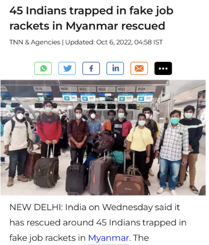同时,使用谷歌图像搜索(Google Image)对文章中的照片进行反搜,可以发现这张照片最早出现在2022年10月6日发表于《印度时报》(Times of India)一篇标题为《45名被困缅甸虚假工作的印度公民获救》的报道中。根据《印度时报》的报道,印度外交部发言人阿林丹·巴奇(Arindam Bagchi)发布推文表示,在印度驻缅甸大使馆和缅甸驻泰国大使馆的共同努力下,现已有32名印度人被成功营救,另有其他13名印度公民被解救并抵达泰米尔纳德邦(Tamil Nadu,位于印度南部的邦)。