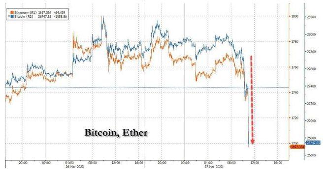 比特币在美股早盘一度跌破2.67万美元,创3月18日以来盘中新低。加密货币相关美股盘中大跌,Coinbase一度超过10%。
