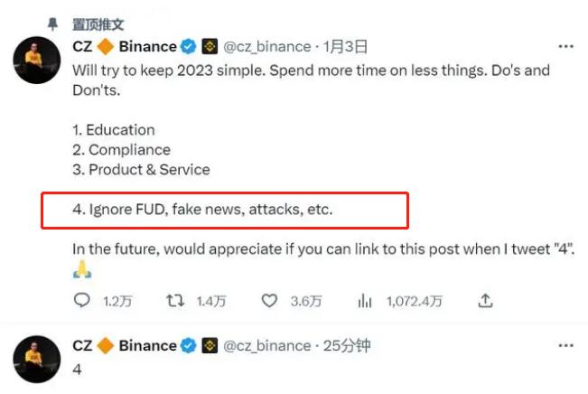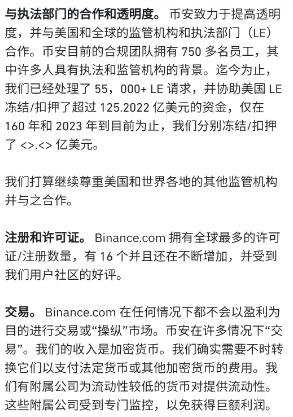 这疑似引用其年初发布的2023专注目标及建议的第四条款作出回应,“忽略FUD(恐惧、不确定性和怀疑)、假新闻、攻击等”,以表示自己的不在意。今天,赵长鹏又在币安官网上,表示对起诉感到“意想不到和令人失望”,并对关键的问题作了说明,陈述了币安的合规和透明。