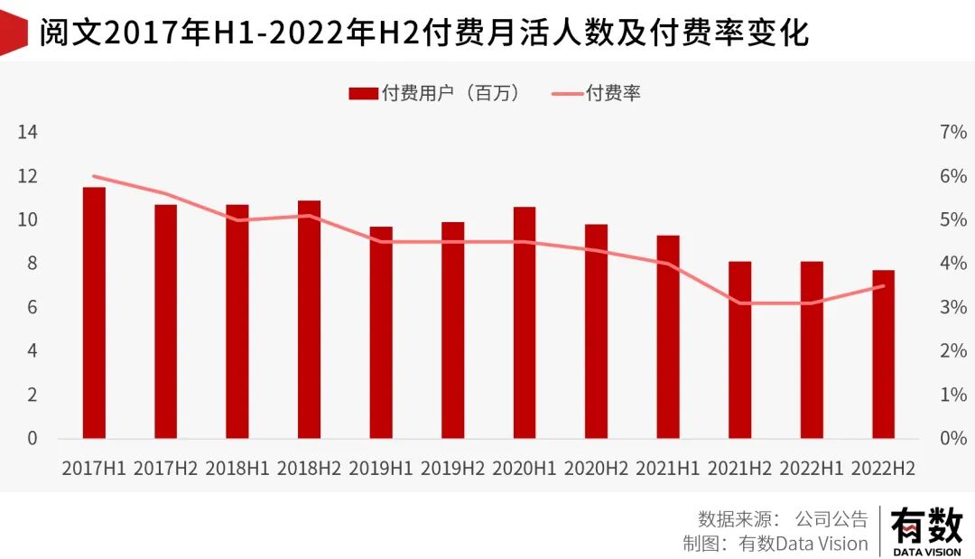 自2018年起,阅文的付费月活开始步入下行趋势,2018年下半年付费月活还有1.09亿人,2022年下半年就下滑至7700万人,付费率也从5%下滑至3.5%。
