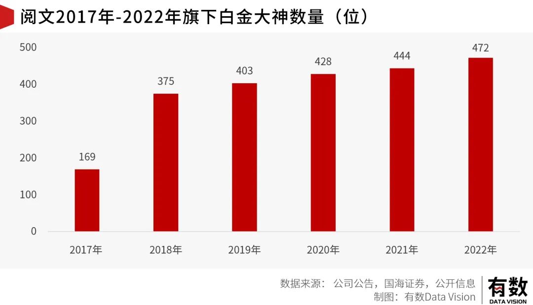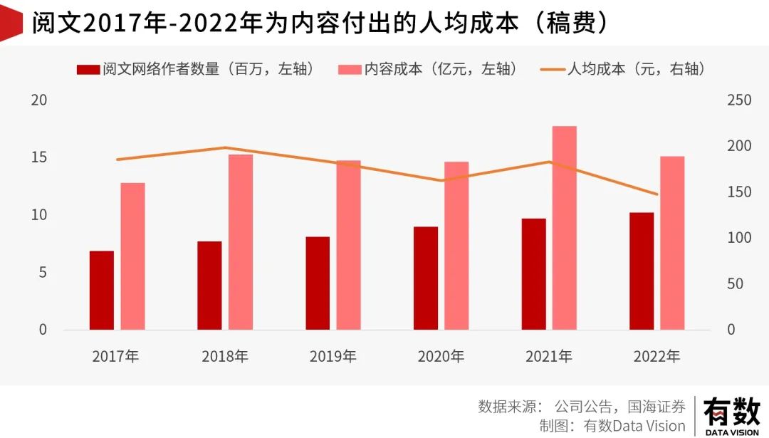 而在创作者这方面,阅文的激励是一年比一年少。根据财报数据显示,到2022年创作者人均成本仅有148元,同比下滑20.3%。