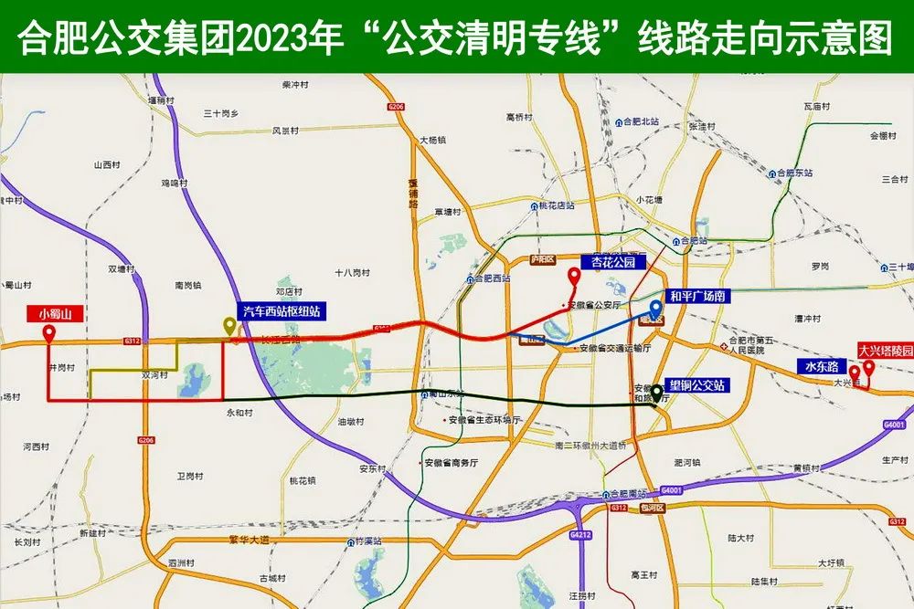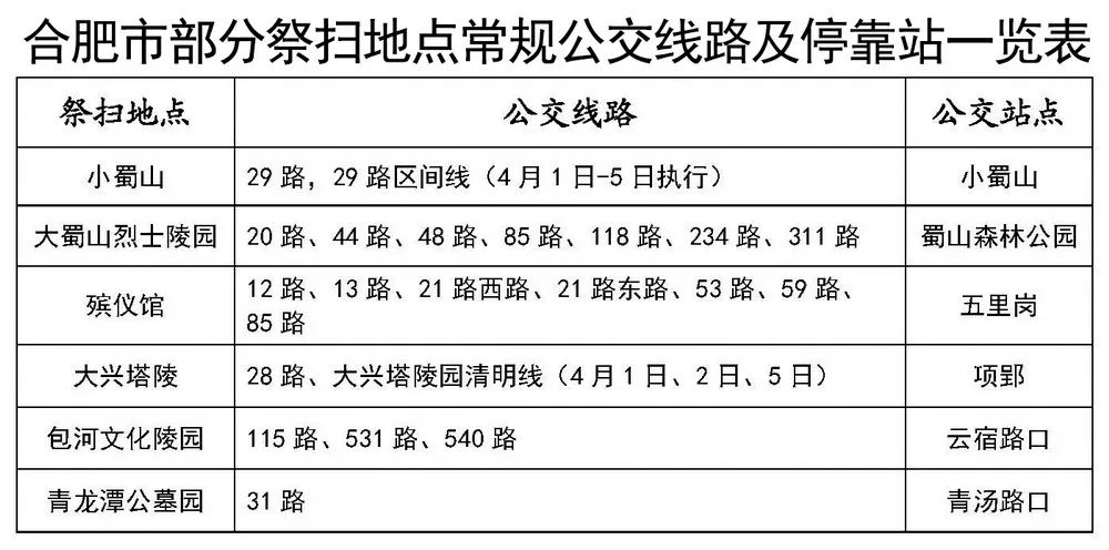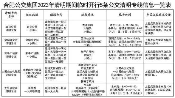 清明节前后,合肥公交集团在加大途经殡仪馆、各公墓、公祭堂公交线路运力、提高公交车发车频次的同时,计划抽调110辆公交车组建5条公交清明专线,分别自市区杏花公园、和平广场南、望铜公交站开往小蜀山,开行大兴塔陵园公交清明专线,并与大蜀山文化陵园携手开行大蜀山文化陵园免费清明循环线路,同时增开29路公交区间线,方便市民扫墓祭祀、踏青旅游乘车出行。