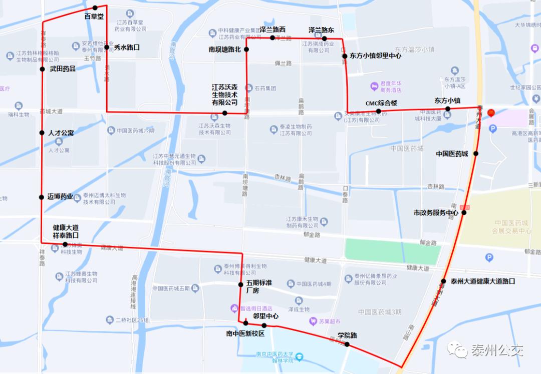 经停站点:南中医新校区、邻里中心、学院路、泰州大道健康大道路口、市政务服务中心、中国医药城、东方小镇、CMC综合楼、东方小镇邻里中心、泽兰路东、泽兰路西、南坝塘路北、江苏沃森生物技术有限公司、秀水路口、百草堂、武田药品、人才公寓、迈博药业、健康大道祥泰路口、五期标准厂房、南中医新校区。