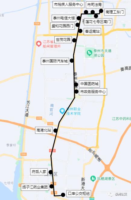 停靠站点:凤凰曦城南门、世茂花园、西湖翠苑东门、客运南站、盛和花园西门、泰州电信大楼、市残疾人服务中心、广电中心西门。