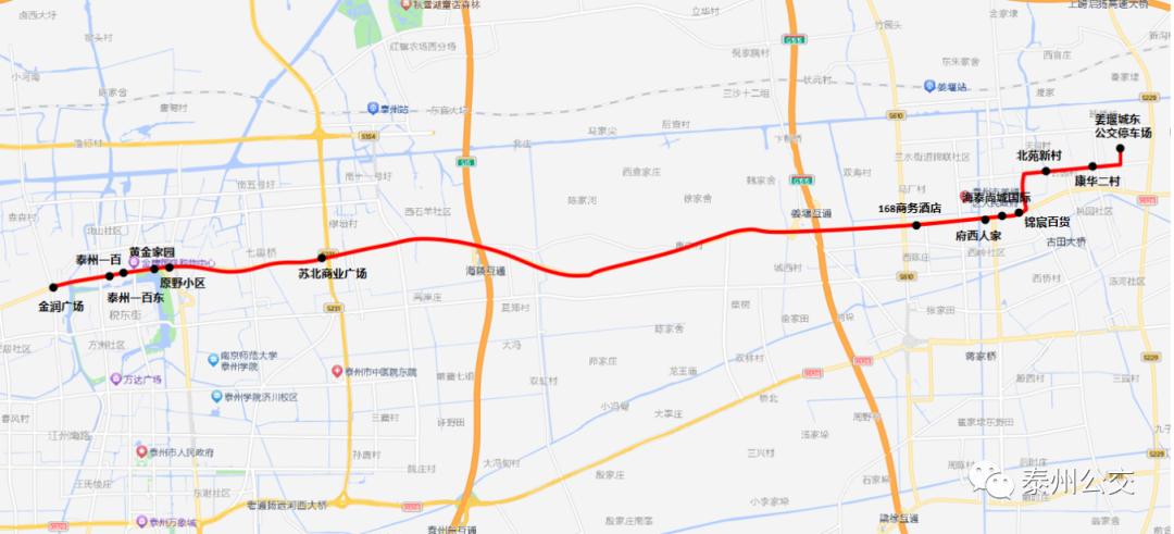 经停站点:姜堰城东公交停车场、康华二村、北苑新村、锦宸百货、海泰尚城国际、府西人家、168商务酒店、苏北商业广场、原野小区、黄金家园、泰州一百东、泰州一百、金润广场。