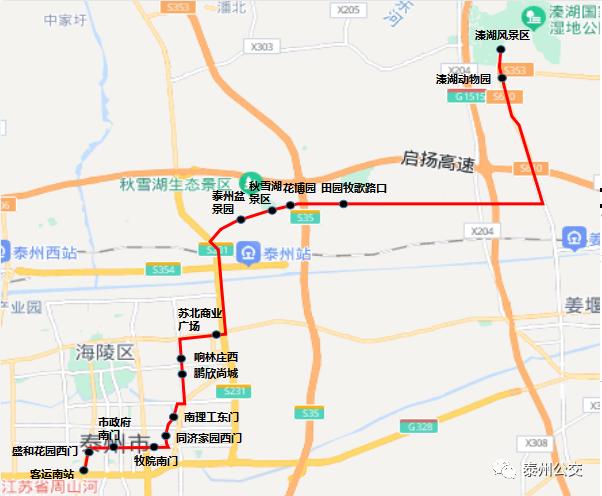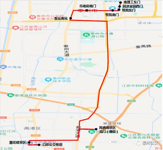 停靠站点:客运南站、盛和花园西门、市政府南门、牧院南门、同济家园西门、南理工东门、鹏欣尚城、响林庄西、苏北商业广场、泰州盆景园、秋雪湖景区、花博园、田园牧歌路口、溱湖动物园、溱湖风景区。