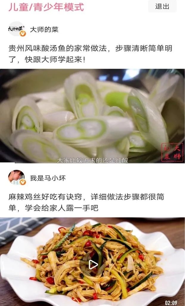 再比如皮皮虾,同样宣称精选了一批教育类、知识类内容呈现在首页,但是10个视频里面有8个视频都是涉及美食,而关于人文科普、课堂教育、生活安全知识等内容的视频几乎没有。(该软件为第一次安装和使用,理论上不存在个性化推荐。)